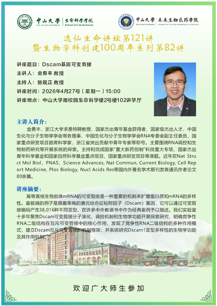 导航痕迹 直播平台 2026年4月27日逸仙生命讲坛121讲:Dscam基因可变剪接 扫描此二维码分享 2026年4月27日逸仙生命讲坛121讲:Dscam基因可变剪接 发布人:李晶 发布日期:2026-04-22 活动时间 2026年04月27日 15:00 - 2026年04月27日 17:00