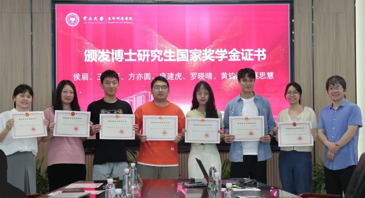 最后,贺雄雷院长为侯眉、王欣丽、方亦圆、庞建虎、罗晓晴、黄钧鸿、蔡思慧共七位同学颁发博士研究生国家奖学金证书,并合影留念。