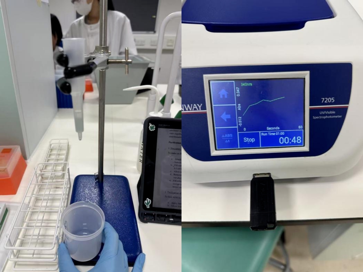 破冰活动的第二天,我的暑校学习生活正式开启,每一周都有不同的学习主题,第一周我们在教授的带领下学习如何通过患者患病信息绘制遗传图谱,并根据家族遗传图谱及等位基因长度分析来判断疾病的基因遗传特性。我在老师的指导下对如何通过设计实验逐步验证某个基因突变是否为引起疾病的原因的过程有了更清晰的梳理和认识,这次训练不仅提升了我的实验设计的整体思维,也使我首次接触到BLAST、UCSC genome browser、PolyPhen等网站。第二周我们回顾了生化课程中的酶动力学方程,并以酵母的乙醇脱氢酶(Alcohol Dehydrogenase,ADH)为材料进行实验技术学习。通过这周的学习,我对米氏方程中各种参数的测定及非线性米氏方程图的绘制有了更深的认识,对其中涉及的实验技术也有了更好的掌握。第三周的学习主要聚焦于第二周ADH酶纯化效果的分析上,主要训练的是SDS-PAGE凝胶电泳和Western Blot实验技术。在SDS-PAGE实验中,通过比对菌液、实验提纯ADH的最好样本和纯ADH的条带,我们可以判断ADH提纯的效果。在Western Blot实验中,我们学习了转膜和一抗、二抗孵育技术,利用抗原与抗体特异性结合的原理,这些技术可特异性地判断提纯物中是否含ADH。这是我第一次接触转膜技术,在实验中出现的各种问题帮助我进一步思考实验中的不足。